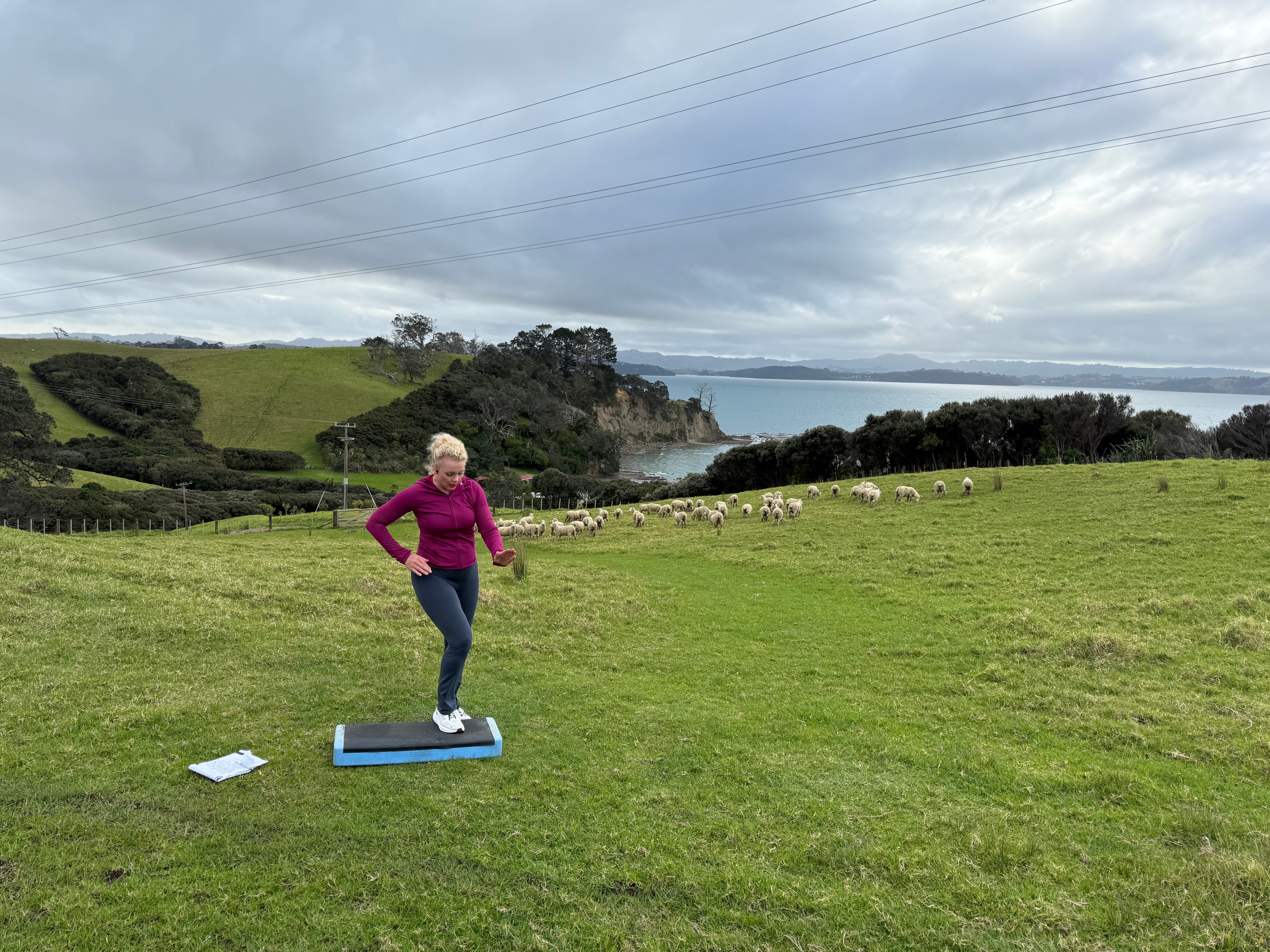 The last two workouts pictured were in New Zealand where we filmed at Scandrett Regional Park with gorgeous sheep π and the beautiful ocean π in our background view.